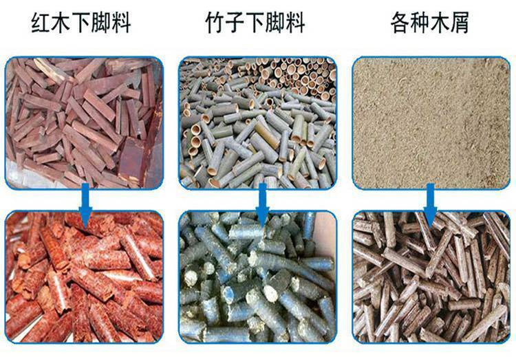 生物質顆粒機可以將原木、木屑、刨花,玉米小麥秸稈、稻草,建筑模板、木工邊角料,果殼、果渣、棕櫚以及污泥木屑等,通過預處理和加工,將